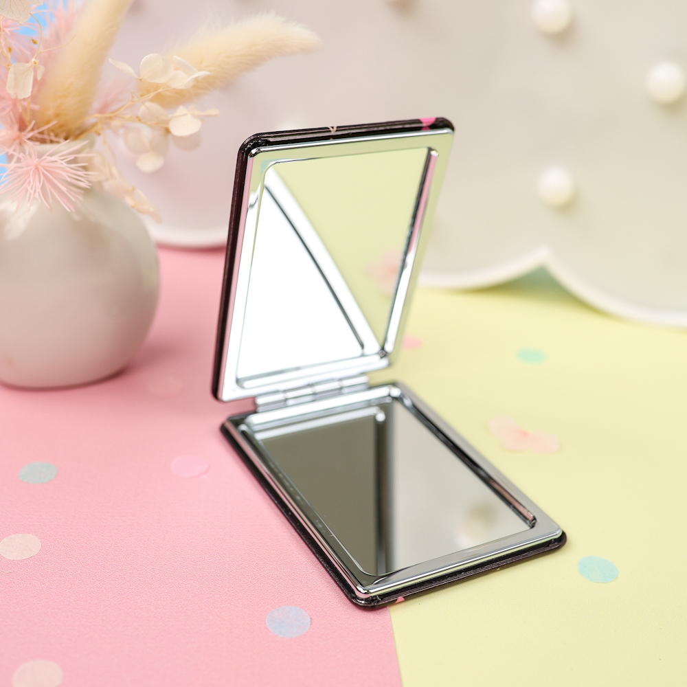Зеркало . Форму может иметь круглую, овальную, квадратную. Аксессуар обрамляется в красивую коробочку, украшенную стразами, интересными принтами. Благодаря небольшим размерам зеркальца легко помещаются в дамской сумочке или косметичке.