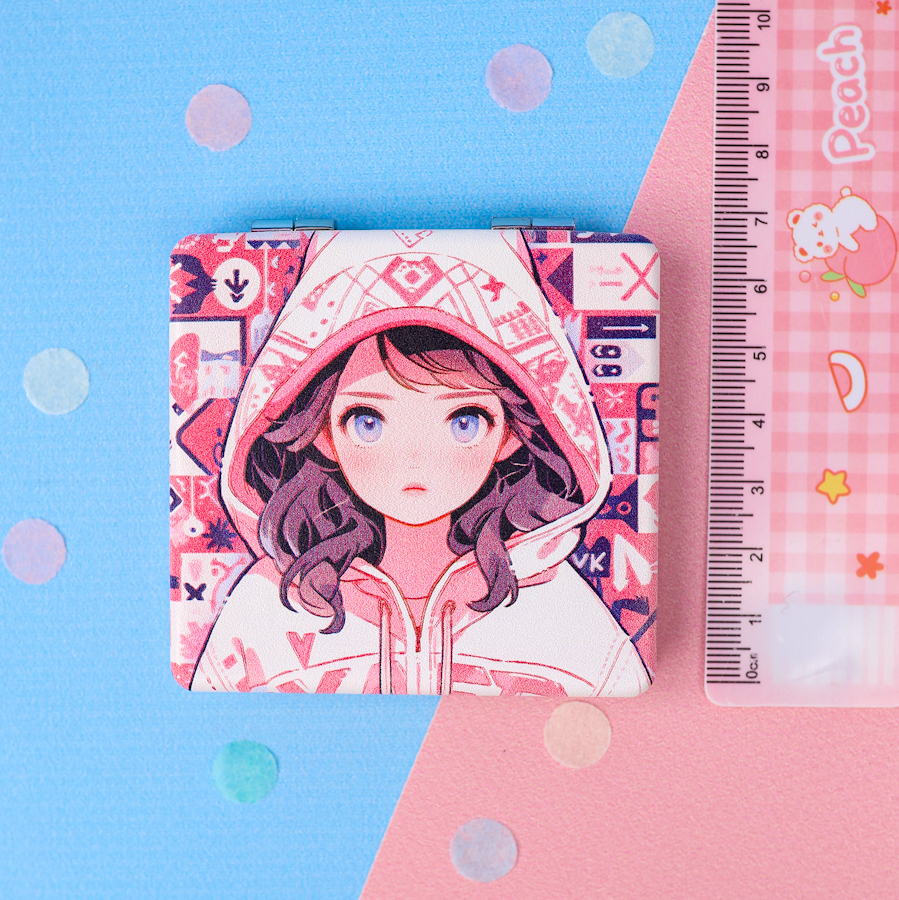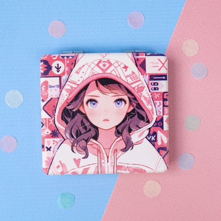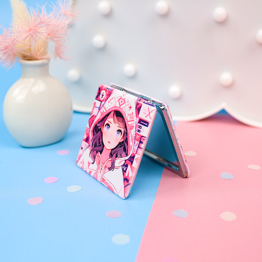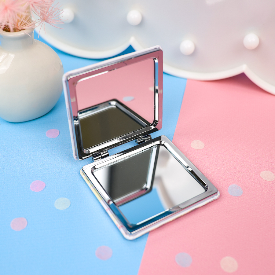 - Складное зеркало по форме и виду напоминает пудреницу. Для маленьких девочек аксессуар выполняется в подходящем по возрасту дизайну. Принты на корпусе в легком детском стиле со сказочной тематикой.