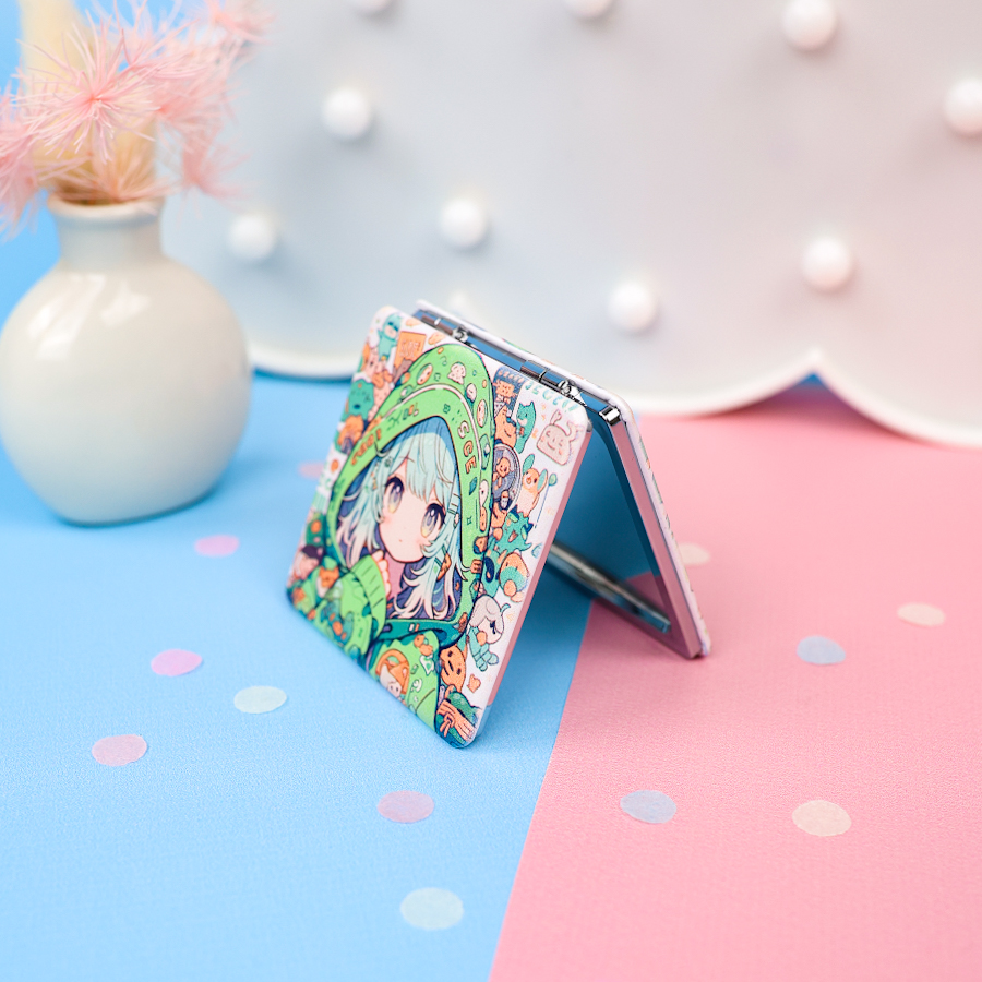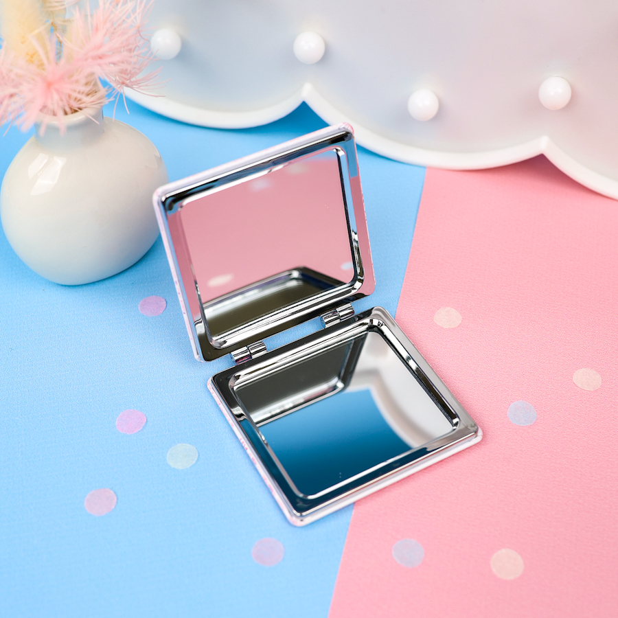 - Складное зеркало по форме и виду напоминает пудреницу. Для маленьких девочек аксессуар выполняется в подходящем по возрасту дизайну. Принты на корпусе в легком детском стиле со сказочной тематикой.