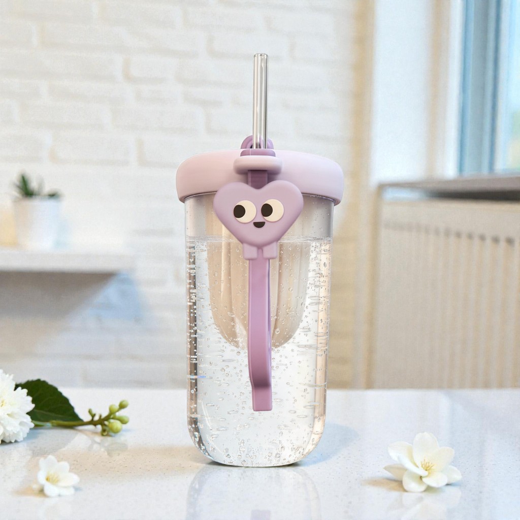 Стакан "Сердце с глазками" светло-фиолетовый, с трубочкой 500мл